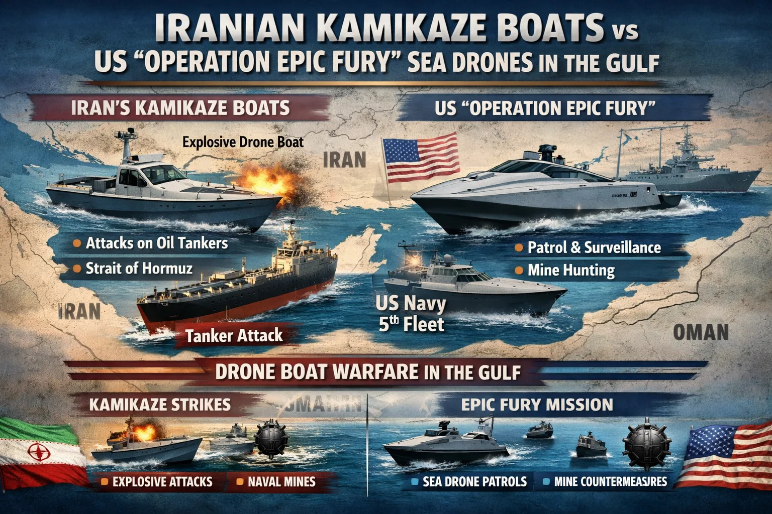 इस महीने की शुरुआत में, ईरान ने समुद्री तनाव बढ़ाते हुए विस्फोटकों से लैस ड्रोन बोट्स को सामान्य मछली पकड़ने वाली नौकाओं के रूप में छिपाकर तैनात किया। इससे वाणिज्यिक जहाजों और वैश्विक ऊर्जा आपूर्ति पर गंभीर खतरा पैदा हुआ।