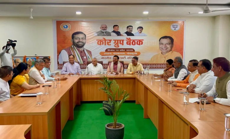 भारतीय जनता पार्टी हरियाणा प्रदेश कार्यालय ‘पंचकमल’ में मंगलवार को कोर ग्रुप की बैठक आयोजित की गई। हरियाणा के मुख्यमंत्री नायब सिंह सैनी, भाजपा प्रदेश अध्यक्ष मोहन लाल बड़ौली, प्रदेश प्रभारी डॉ. सतीश पूनिया, राष्ट्रीय उपाध्यक्ष सौदान सिंह, राष्ट्रीय महासचिव ओम प्रकाश धनखड़, केंद्रीय संसदीय बोर्ड सदस्य डा. सुधा यादव, केंद्रीय मंत्री कृष्णपाल गुर्जर, राज्यसभा सांसद सुभाष बराला, डा. कमल गुप्ता, कैप्टन अभिमन्यु, संगठनमंत्री फणीन्द्रनाथ शर्मा सहित कोर ग्रुप समिति के अन्य वरिष्ठ सदस्य उपस्थित रहे।